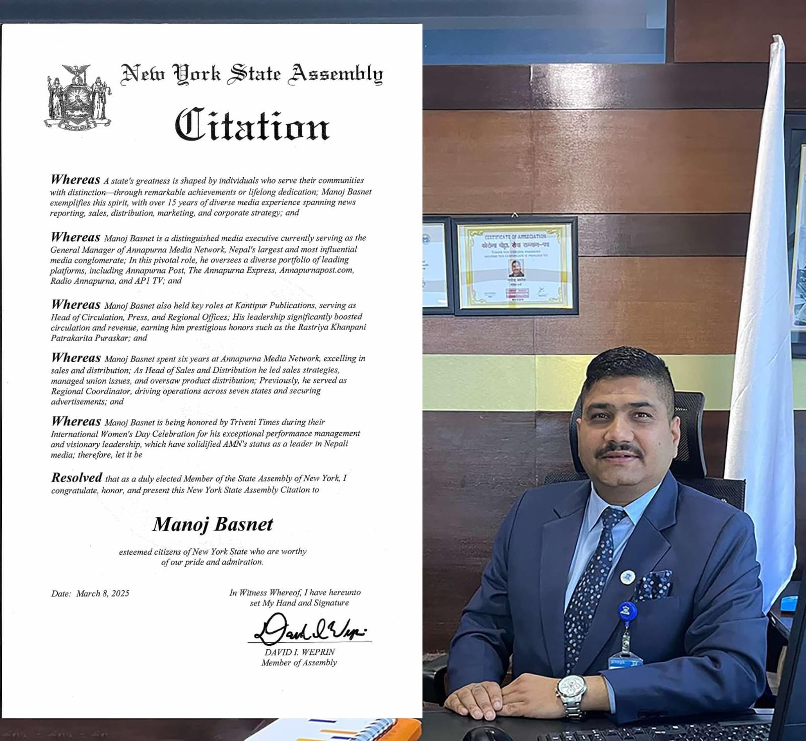 काठमाडौँ । मिडिया व्यवस्थापनमा उत्कृष्ट कार्यकौशल देखाउदै दुरदर्शी नेतृत्व प्रदान गर्न सफल भएको भन्दै न्यूयोर्क राज्यका एसेम्बली मेम्बर डेभिड आई वेप्रिनले अन्नपूर्ण मिडिया नेटवर्कका महाप्रबन्धक मनोज बस्नेतलाई सम्मानित गरेका छन । अन्तराष्ट्रिय नारी दिवसको अवसरमा अमेरिकाको न्यूयोर्कबाट संचालिन मिडिया...