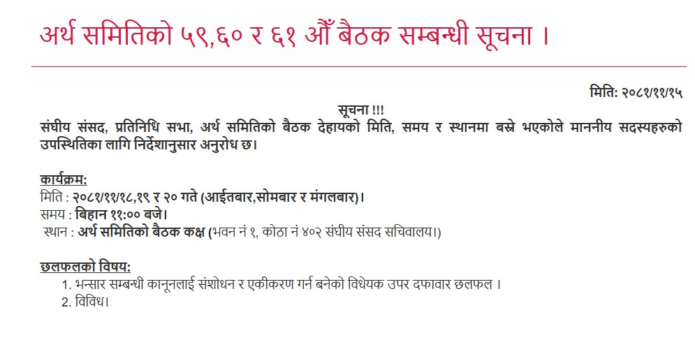 तीन दिन लगातार अर्थ समितिको बैठक बस्ने, भन्सार विधेयकलाई अन्तिम रुप दिइँदै