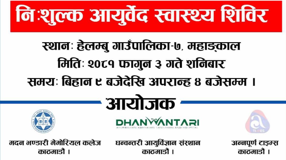 काठमाडौं । सिन्धुपाल्चोकको हेलम्बु गाउँपालिकामा निःशुल्क आयुर्वेद स्वास्थ्य शिविर हुने भएको छ । हेलम्बु गाउँपालिकाको सहयोग तथा मदन भण्डारी मेमोरियल कलेज, धन्वन्तरी आयुर्विज्ञान संस्थान र अन्नपूर्ण टाइम्सको संयुक्त आयोजनामा आगामी ३ फागुनमा आराम, आनन्द र आरोग्य भन्ने मूल नाराका...