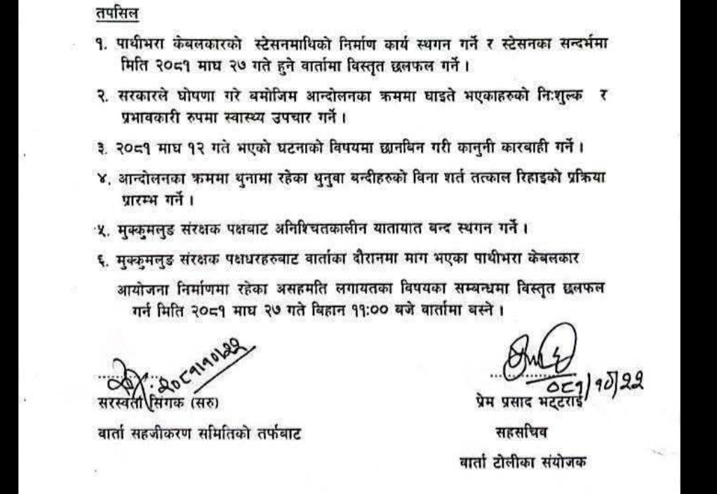 काठमाडौं । सरकार र नो केवलकार अभियानसहित अन्य जनजाति सम्बद्ध संगठनबीचमा भएको वार्ता तत्कालको लागि अस्थायी युद्धविराम गर्ने सहमतिमा सम्झौतामा भएको छ । आज राति अबेर भएको सम्झौता अनुसार तत्कालका लागि पाथिभरा केवलकारको स्टेशन निर्माण कार्य स्थगित गर्ने र...