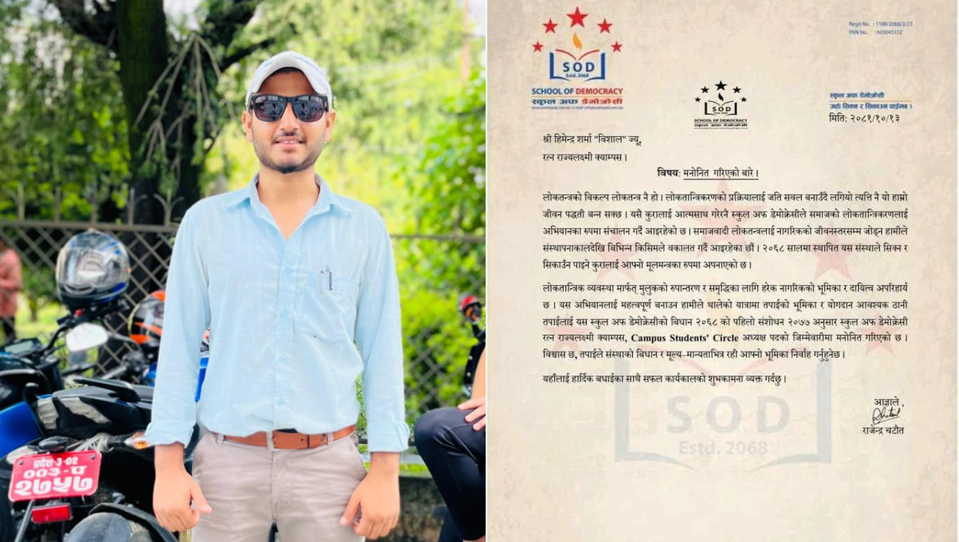 काठमाडौँ । नेपाल विद्यार्थी संघ रत्न राज्यलक्ष्मी क्याम्पसका युवा विद्यार्थी नेता हिमेन्द्र शर्मा (विशाल) स्कुल अफ डेमोक्रेसी रत्न राज्यलक्ष्मि क्याम्पसको अध्यक्षमा मनोनित भएका छन । स्कुल अफ डेमोक्रेसीले नेवि संघ नेता शर्मालाई रत्न राज्यलक्ष्मि क्याम्पसको अध्यक्षमा मनोनित गरेको हो...