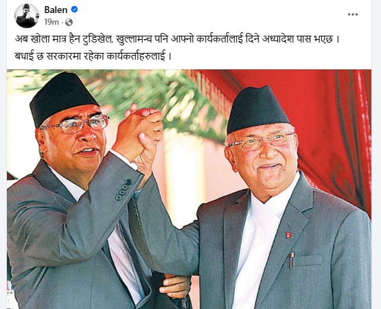 बालेनले भने, ‘टुडिखेल, खुल्लामन्च पनि आफ्नो कार्यकर्तालाई दिने अध्यादेश पास भएछ’