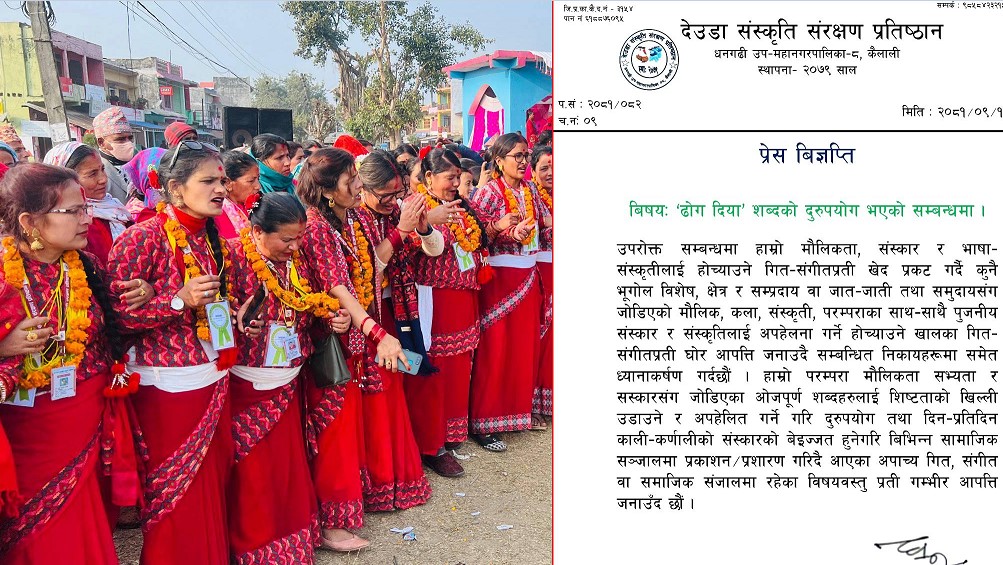 काठमाडौँ । देउडा संस्कृति संरक्षण प्रतिष्ठानले ढोग दिया शब्दको दुरुपयोग र त्यससँग जोडिएका गित संगीतप्रति घोर आपत्ति जनाएको छ। प्रतिष्ठानका अध्यक्ष ध्रुव बहादुर सिंहले आज एक प्रेस बिज्ञप्ति जारी गर्दै यस्तो गित संगीतको प्रसारलाई समाजको संस्कार र परम्परासँग मेल...