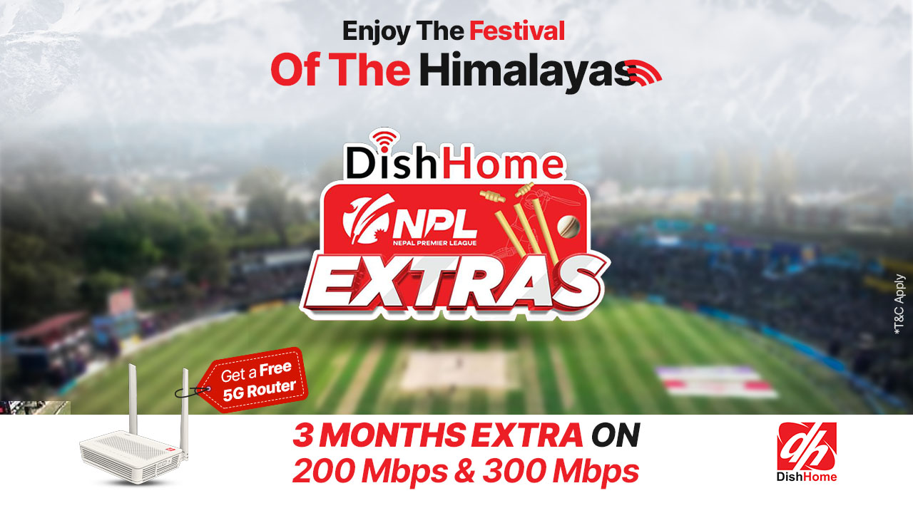 एनपीएल फ्यानका लागि डिशहोम इन्टरनेटमा ३ महिनाको बोनस र निःशुल्क ५जी राउटर
