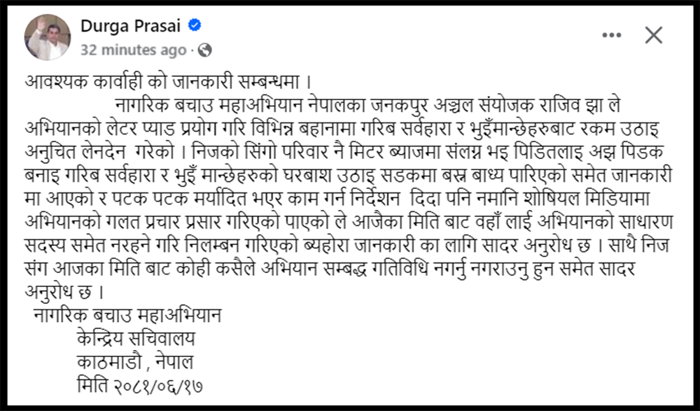 काठमाडौँ । नेपालमा कर्मचारी प्रशासन र राजनीतिक नेतृत्व भ्रष्टाचारमा लिप्त रहेको भाषणा घन्काउँदै हिड्ने सामाजिक अभियान्ता तथा ब्यवसायी दुर्गा प्रसाईंका अभियान्ताले नै घुस खाएको खुलासा भएको छ । भ्रष्टाचारविरुद्धको कडा आवाज उठाउँदै आएका प्रसाईंको नेतृत्वमा रहेको नागरिक बचाउ महाअभियान...