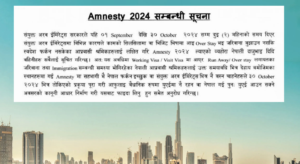 यूएईमा अलपत्र तथा गैरकानूनी रुपमा बसिरहेकालाई आममाफी, कुनै शुल्क तिर्नु नपर्ने
