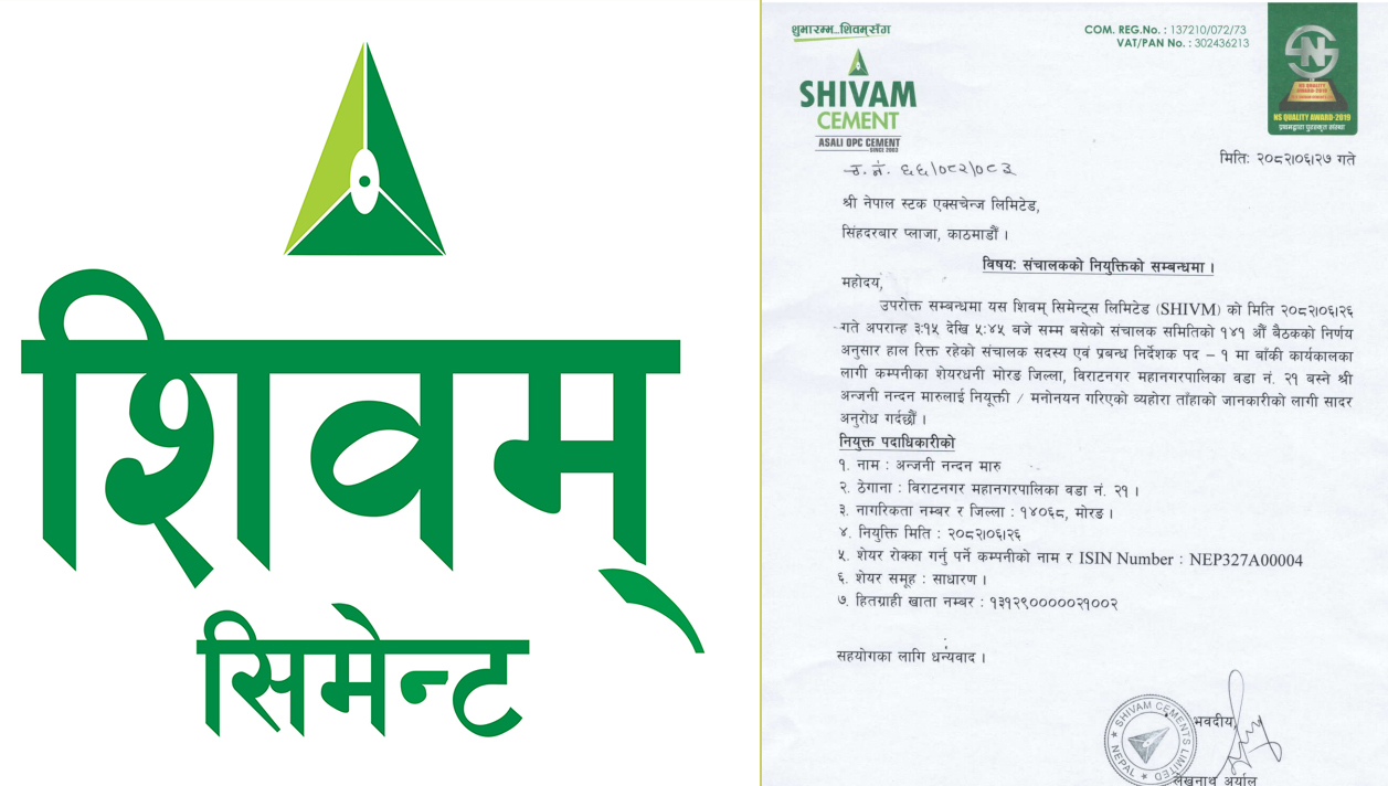 काठमाडौं । शिवम् सिमेन्टको सञ्चालकमा अन्जनी नन्दन मारु नियुक्त भएकी छिन् । कम्पनी सञ्चालक समितिको असोज २६ गते बसेको बैठकको निर्णयले रिक्त रहेको उक्त पदमा मारुलाई नियुक्त गरेको हो । कम्पनीले साधारण समुहको तर्फबाट मारुलाई सञ्चालकमा नियुक्त गरेको छ...