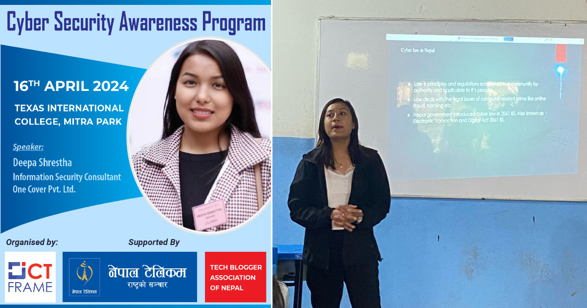 काठमाडौं । राजधानी काठमाडौंको चाबहिल मित्रपार्कमा रहेको टेक्सास कलेजमा विद्यार्थीहरुलाई लक्षित गरेर साईबर सेक्युरिटी सम्बन्धी कार्यक्रम यही अप्रिल १६ गते सम्पन्न भएको छ । आईसिटी फ्रेम म्यागेजिनले आयोजना गरेको कार्यक्रममा कलेजमा दर्जनौं विद्यार्थीहरुले सहभागिता जनाएका थिए । म्यागेजिनकी सम्पादक...