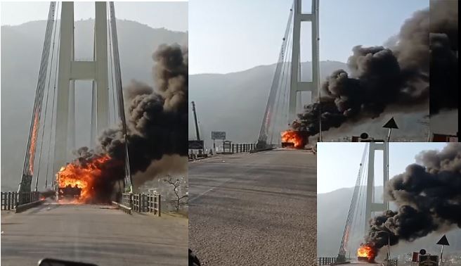 कर्णाली पुलको बीचमा ट्रक आगजनि