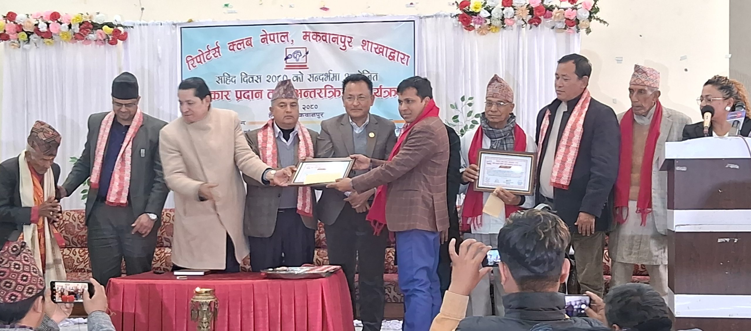 हेटौडा । जनआन्दोलन २०६२।०६३ मा प्रहरी गोलीबाट शहादत हुनु भएका मकवानपुरका सहिद बासु घिमिरेको नाममा स्थापित पुरस्कारबाट बीमापोष्टका सम्पादक नबराज न्यौपाने र बरिष्ठ पत्रकार नवराज शर्मा तिमिल्सिना प्रदान गरिएको छ । रिपोर्टर्स क्लव नेपाल, मकवानपुर शाखाले आज माघ १६...
