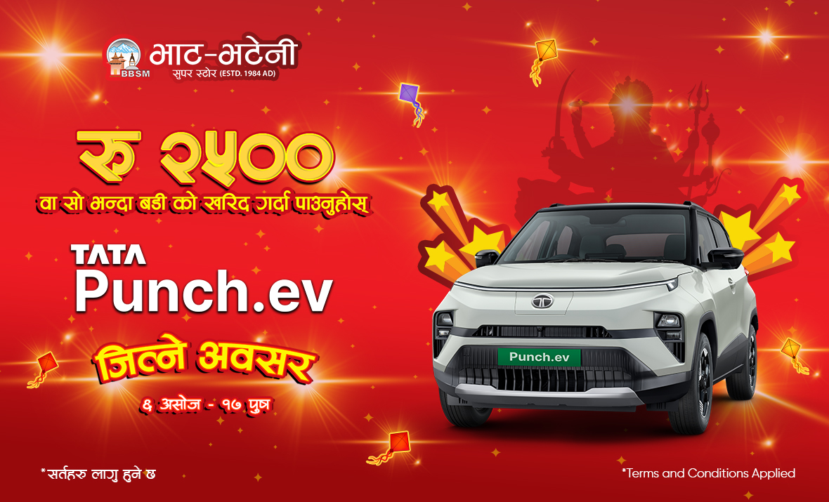 काठमाडौं । देशकै सबैभन्दा ठूलो सुपरमार्केट भाटभटेनीबाट दशैं, तिहार र छठको अवसर पारेर किलमेल गर्दा टाटाको ‘पन्च ईभी’ जित्न सकिने भएको छ। यो चाडपर्वको विशेष अवसरमा भाटभटेनीबाट किनमेल गर्ने ग्राहकले टाटाको ‘पन्च ईभी कार जित्न सक्ने मौका प्राप्त गर्ने...
