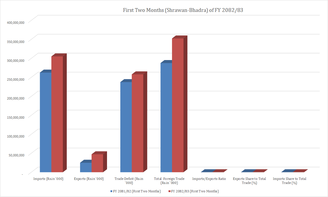 दुई महिनाको वैदेशिक व्यापार: निर्यात ८८ प्रतिशतले उकालो, व्यापार घाटा अझै २५७ अर्बभन्दा माथि