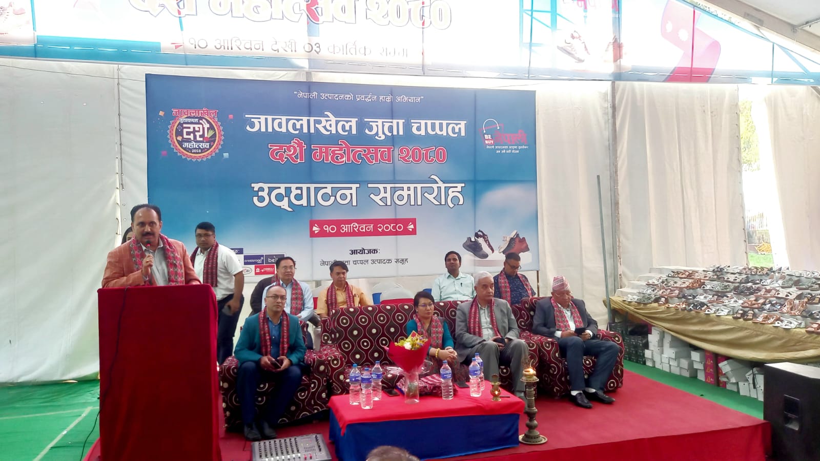 काठमाडौं । नेपाली जुत्ता चप्पल उत्पादक समुहद्धारा “नेपाली उत्पादनको प्रवद्धन हाम्रो अभियान” भन्ने मुख्य नारा सहित जावलाखेल जुत्ता चप्पल दशैं महोत्सव २०८० जावलाखेल फुटबल मैदानमा उद्घाटन भएको छ । स्वदेशी उत्पादनलाई प्रवर्द्धन गर्ने उदेश्यले आयोजना गरिएको महोत्सवको बुधबार ललितपुर...