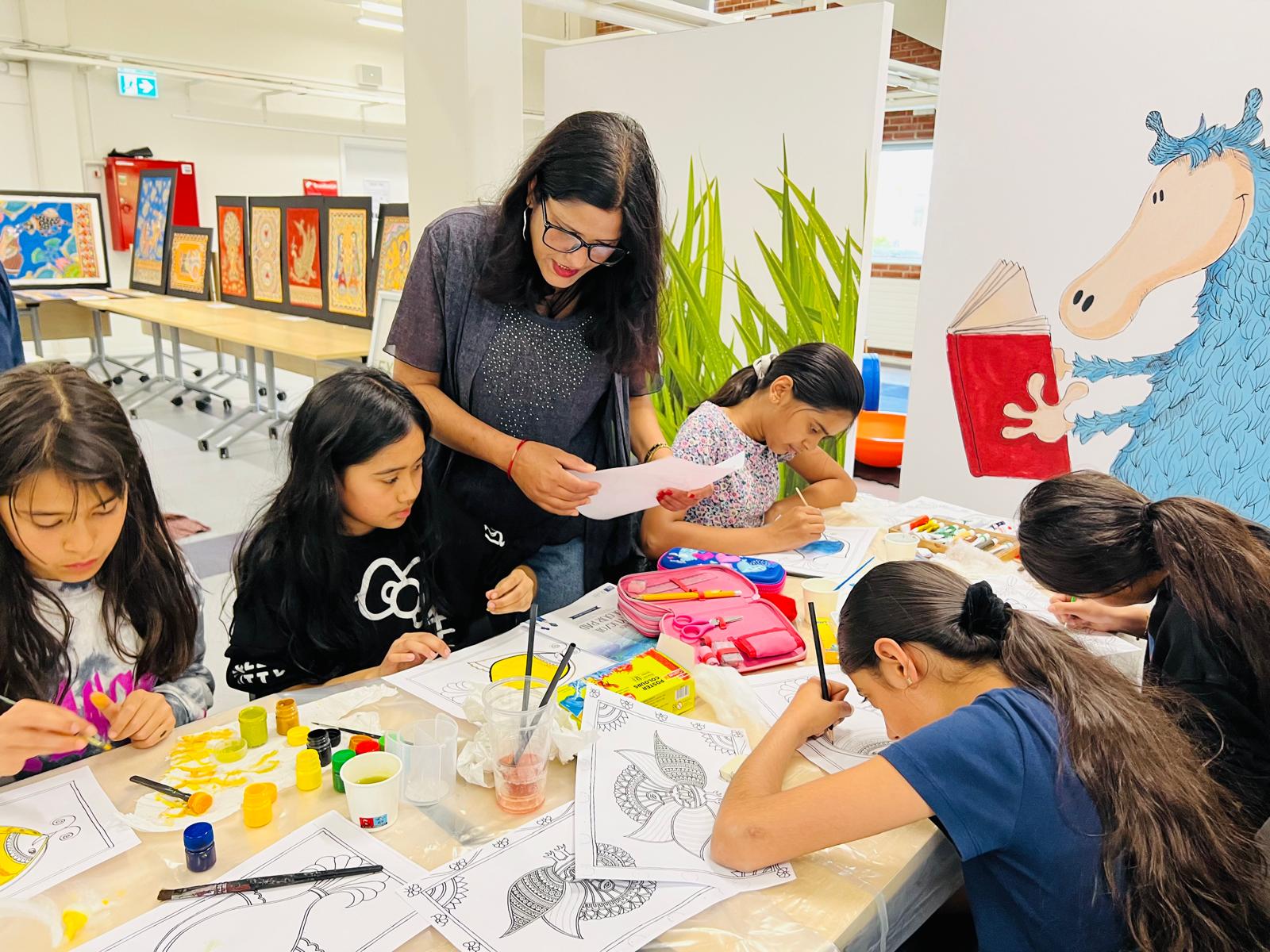 चित्रकार रन्जु यादवले डेनमार्कको राजधानीमा बालबालिकालाई सिकाइन् मिथिला चित्र