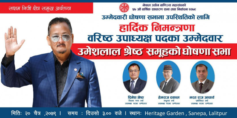 काठमाडौं । नेपाल उद्योग वाणिज्य महासंघको आसन्न निर्वाचनमा वरिष्ठ उपाध्यक्षका उम्मेदवार उमेशलाल श्रेष्ठ समुहले सोमबार आफ्नो टीम घोषणा गर्ने भएको छ । सो समुहले सोमबार दिउँसो ३ बजे हेरिटेज गार्डेन सानेपाबाट आफ्नो टीमको उम्मेदवारी घोषणा गर्न लागेको हो ।...