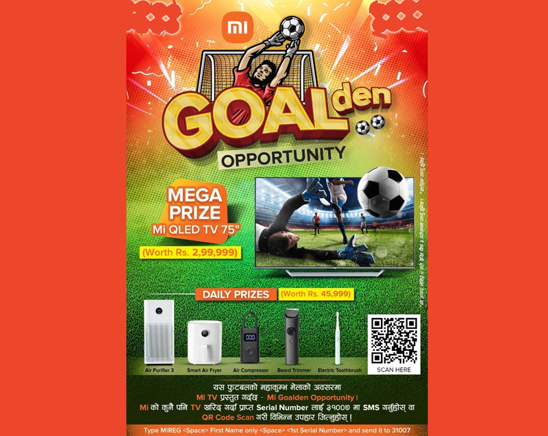 काठमाडौं । नेपालको अग्रणी स्मार्टफोन र टि.भि. कम्पनी शाओमीले वर्ल्ड कप २०२२ लाई लक्षित गरेर आफ्ना ग्राहकहरुको लागि आकर्षक अफर ल्याएको छ । यस अफर अन्तर्गत ग्राहकहरुले मी अथवा रेडमी टेलिभिजन खरिद गर्दा ७५ इन्चको मी क्यु एलइडि टेलिभिजन...