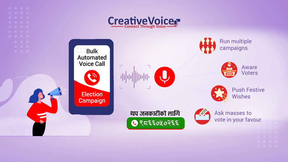 काठमाडौं । क्रिएटिभ क्रिएसन्स एण्ड मिडियाले चुनावको मुखैमा भ्वाइस म्यासेज सेवा सार्वजनिक गरेको छ । कम्पनीले एक विज्ञप्ति जारी गर्दै सूचना प्रवाहमा थप सहज बनाउने उद्देश्यले क्रिएटिभ भ्वाइसको नाममा नयाँ सेवा उपलब्ध गराउने जनाएको हो । यो सेवा बल्क...