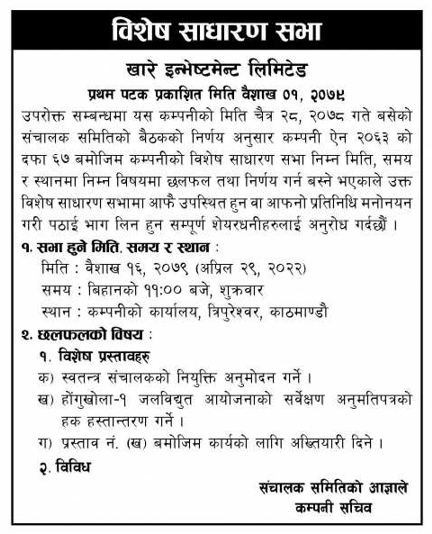खारे इन्भेष्टमेन्टको विशेष साधारण सभा बैशाख १६ गते, के के छन् एजेण्डा ?