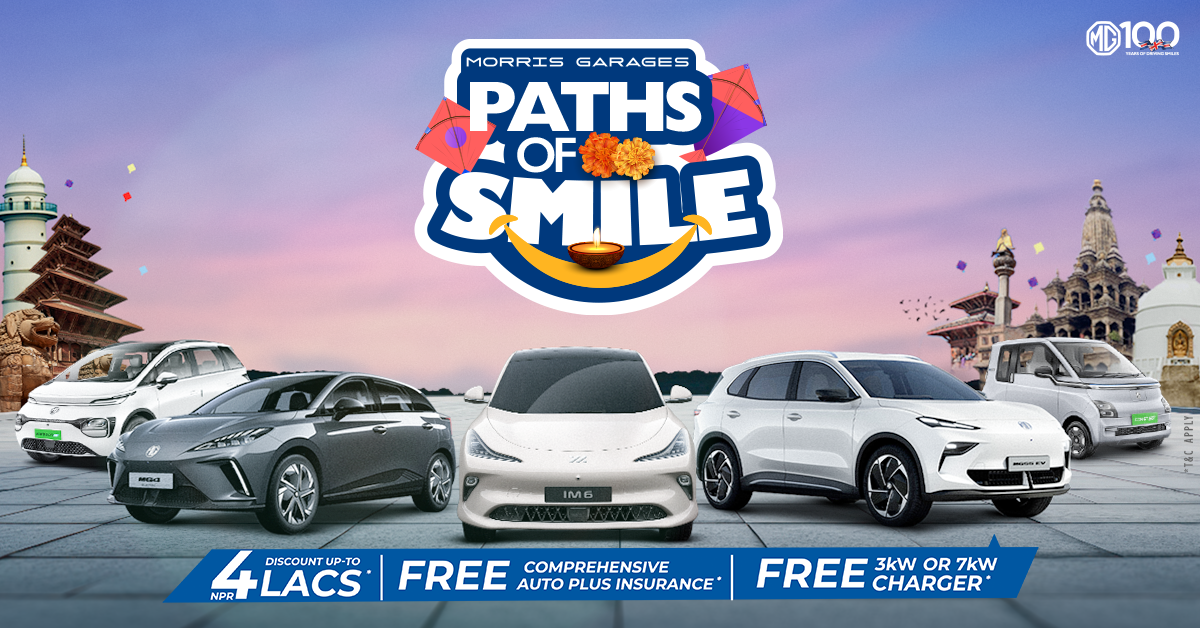 काठमाडौं। नेपालमा एमजी गाडीको आधिकारीक वितरक प्यारामाउन्ट मोटर्स प्रालिले दशैं, तिहार र छठ पर्वको अवसरमा विशेष योजना ‘मोरिस गराजेज पाथ्स अफ स्माइल’ सार्वजनिक गरेको छ। यस योजना अन्तर्गत ग्राहकहरूले एमजीका विभिन्न मोडेलहरू एमजी ४ इभी, एमजी कमेट इभी, एमजी...