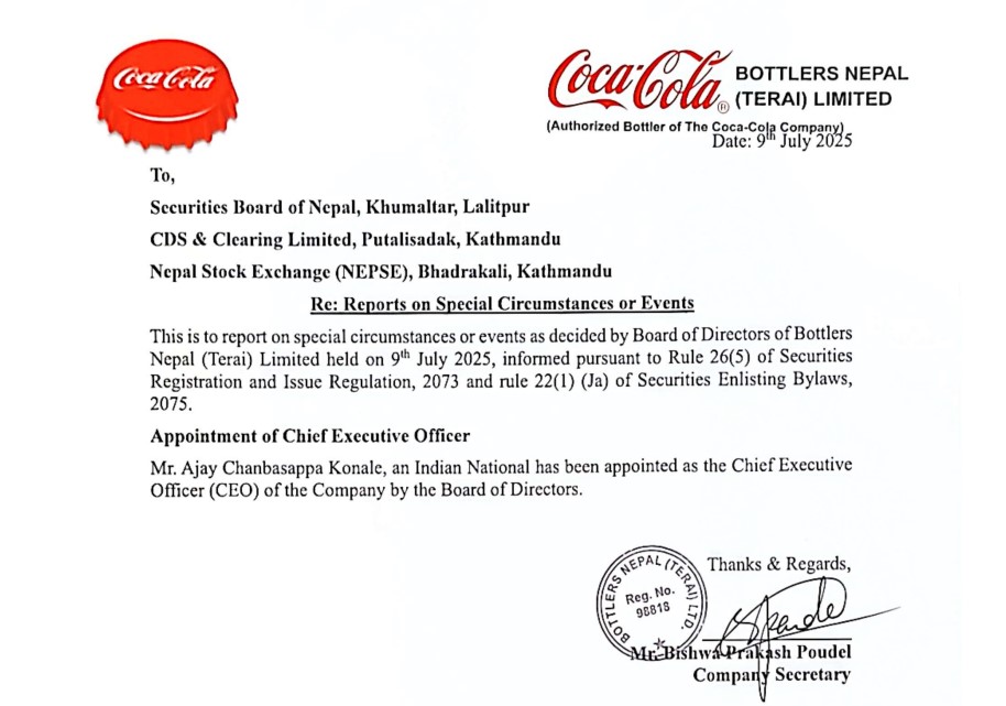 काठमाडौं । बोटलर्स नेपाल (तराई) लिमिटेडको प्रमुख कार्यकारी अधिकृतमा अजय चन्बासप्पा कोनाले नियुक्त भएका छन् । कम्पनी सञ्चालक समितिको असार २५ गते बसेको समितिको बैठकको निर्णयले उनलाई प्रमुख कार्यकारी पदमा नियुक्त गरेको हो । उनलाई आगामी चार वर्षको लागि...