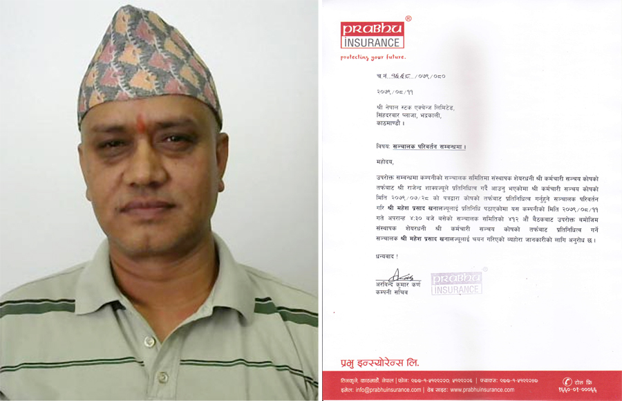 काठमाडौं । प्रभु इन्स्योरेन्स लिमिटेडको संचालक परिवर्तन भएको छ । कम्पनीका संस्थापक शेयरधनी कर्मचारी संचय कोषको तर्फबाट प्रतिनिधित्व गर्ने महेश खनाल प्रभु इन्स्योरेन्सको संचालकमा चयन भएका हुन् । यसअघि कोषकै तर्फबाट राजेन्द्र शाक्यले प्रतिनिधित्व गदैै आएकोमा कोषको कात्तिक २८...