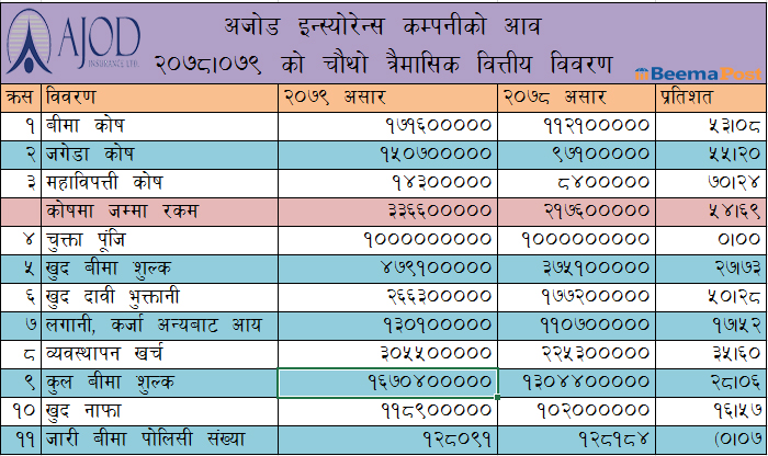 अजोड इन्स्योरेन्सको कुल बीमाशुल्क आर्जन एक अर्ब ६७ करोड माथि, अन्य सूचकमा देखियो सुधार