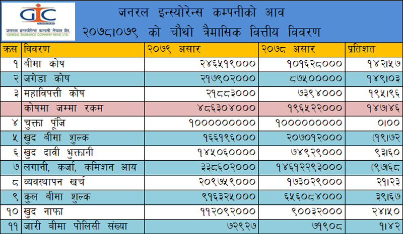 काठमाडौं । जनरल इन्स्योरेन्स कम्पनी नेपाल लिमिटेडले गत आर्थिक वर्षको चौथो त्रैमाससम्मको वित्तीय विवरण आज प्रकाशित गरेको छ । विवरणअनुसार कम्पनीले कोषहरुको आकारमा उल्लेख्य बृद्धि गरेको देखिएको छ । गत आर्थिक वर्षको असार मसान्तसम्म जनरल इन्स्योरेन्सले २४ करोड ६५...