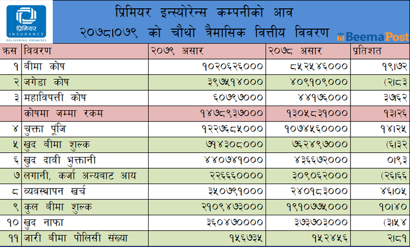 प्रिमियर इन्स्योरेन्सको खुद बीमा शुल्क आर्जन र मुनाफा घट्यो, अन्य सूचक समेत खस्किदै
