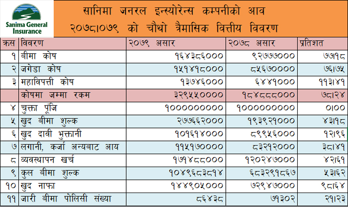 सानिमा जनरल इन्स्योरेन्सको बीमाशुल्क आर्जन र मुनाफामा उत्साहजनक सुधार