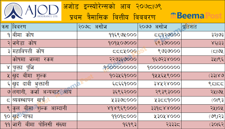 पहिलो त्रैमासमा अजोड इन्स्योरेन्सको व्यवसाय २५ प्रतिशतले बृद्धि, आम्दानीमा बृद्धि हुँदा अन्य सूचांक यस्तो