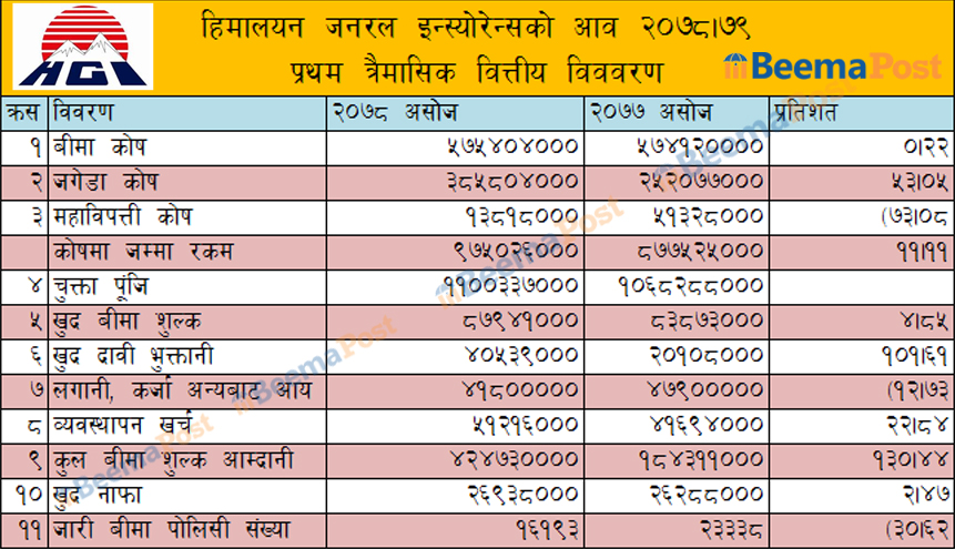 हिमालयन जनरल इन्स्योरेन्स कम्पनीको कूल बीमा शुल्क १३० प्रतिशतले बृद्धि, खुद नाफा बढ्यो