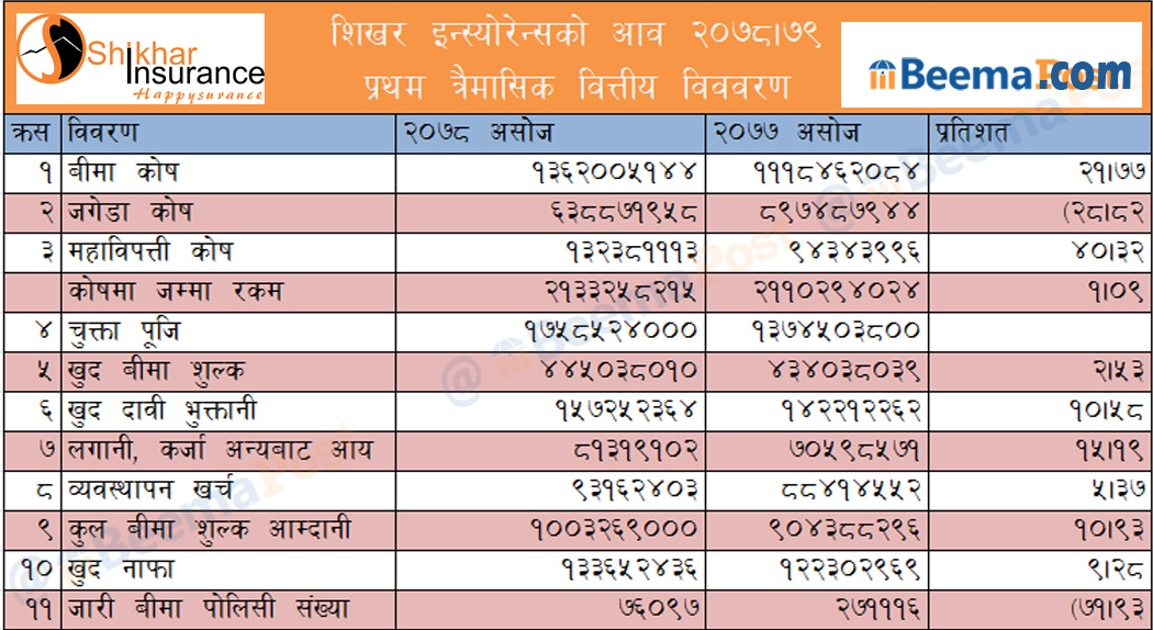 पहिलो त्रैमासमा शिखर इन्स्योरेन्सको प्रगति कायमै, कूल बीमा शुल्क आम्दानी अर्बमाथि, तथ्याङ्कमा यस्तो देखियो कम्पनी