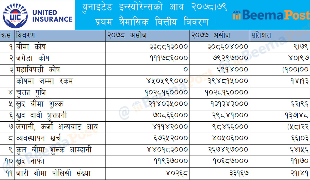 युनाइटेड इन्स्योरेन्सको वित्तीय विवरणमा कोरियो खराव चित्र, आम्दानी ५८ प्रतिशले घट्दा दावी भुक्तानी १३७ प्रतिशतले बढ्यो