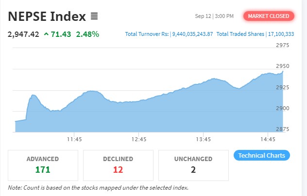 काठमाडौं । साताको पहिलो दिन नेप्सेमा हरियाली छाएको छ । । आज नेप्से परिसूचक ७१ दशमलव ४३ अंकले बृद्धि भई २९४७.४२ विन्दुमा कायम भएको छ । आज नेप्सेमा सूचिकृत २३१ कम्पनीको १ करोड ७१ लाख ३३३ कित्ता शेयर किनबेच...
