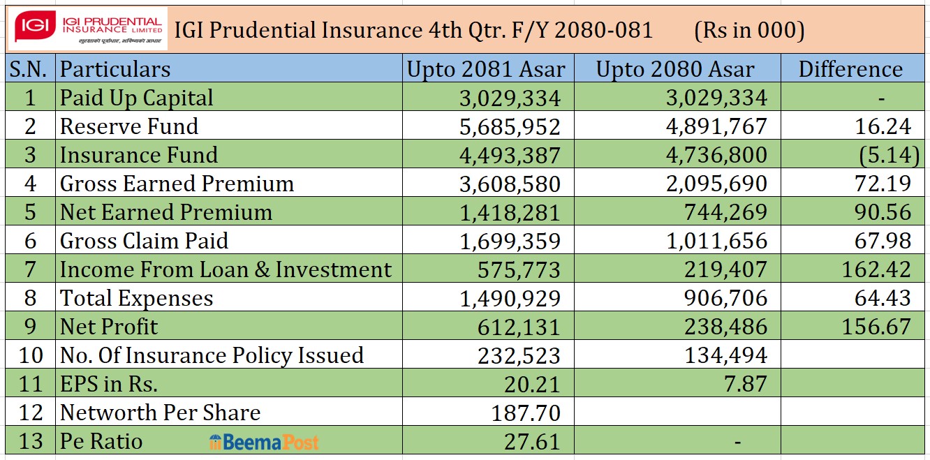आईजीआई प्रुडेन्सियल इन्स्योरेन्सको वित्तीय विवरणमा झल्कियो प्रगति, मुनाफा १५६% र कुल बीमा शुल्क ७२% वृद्धि