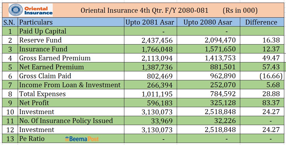 ओरियण्टल इन्स्योरेन्सको मुनाफा ५९ करोड बढी, कुल बीमा शुल्क ४९% वृद्धि, यस्तो छ समग्र वित्तीय अवस्था