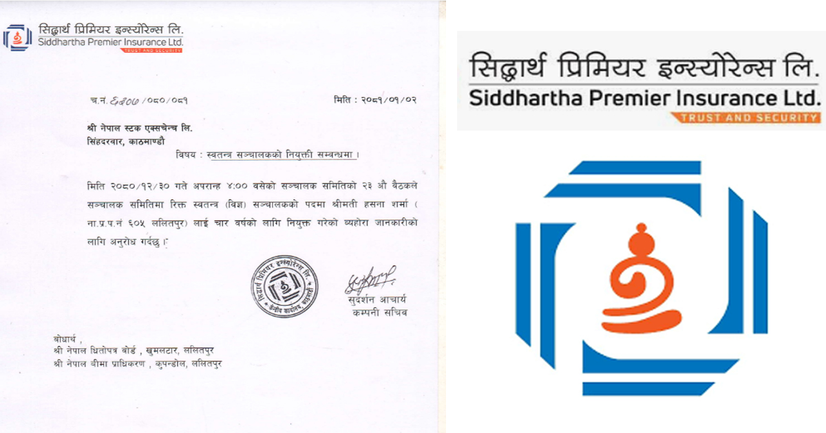 काठमाडौं । सिद्धार्थ प्रिमियर इन्स्योरेन्स लिमिटेडको रिक्त रहेको सञ्चालकमा हसना शर्मा नियुक्त भएकी छन् । कम्पनीको चैत ३० गते अपरान्ह ४ बजे बसेको सञ्चालक समितिको बैंठकको निर्णयले शर्मालाई सञ्चालक पदमा नियुक्त गरेको हो । कम्पनी सञ्चालकको सो पद केही...