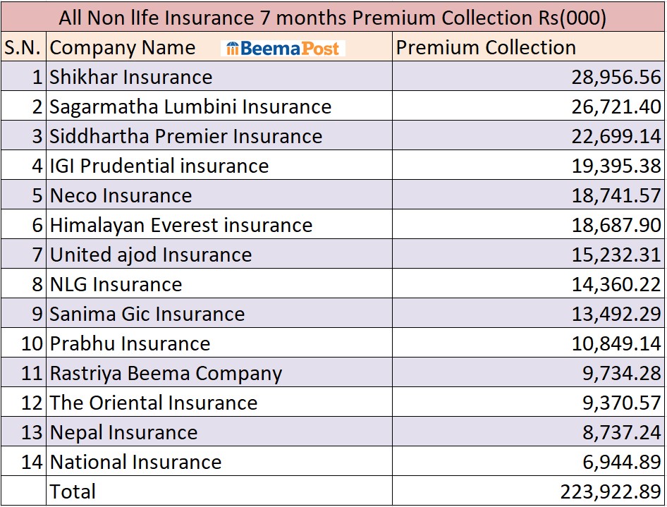 निर्जिवन बीमा कम्पनीहरुको कुल बीमाशुल्क आर्जन २२ अर्ब माथि, कुन कम्पनीको कति ?