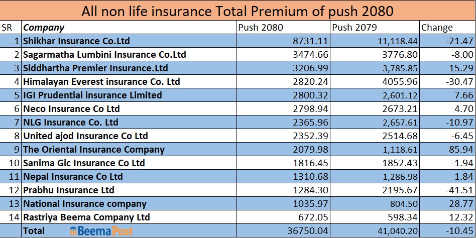 निर्जिवन बीमा कम्पनीहरुको बीमाशुल्क आर्जन घट्यो, आठ कम्पनीको वृद्धि, ६ को व्यवसाय ओरालोतर्फ (सूची सहित)