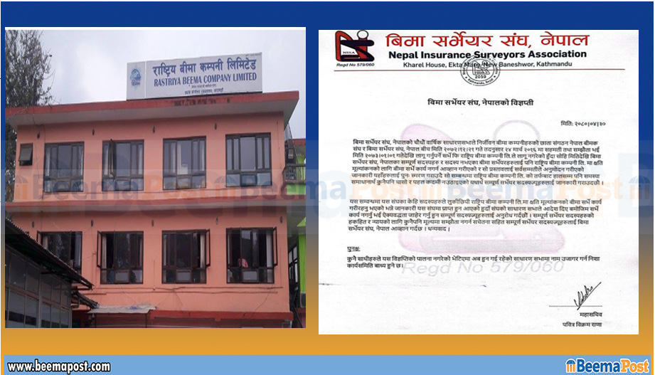 राष्ट्रिय बीमा कम्पनीले बीमक संघ र सर्भेयर संघ बीचको सहमति लागू नगरेको गुनासो, सर्भेयरलाई न्यूनतम सर्भे शुल्क नपाए काम नगर्ने चेतावनी