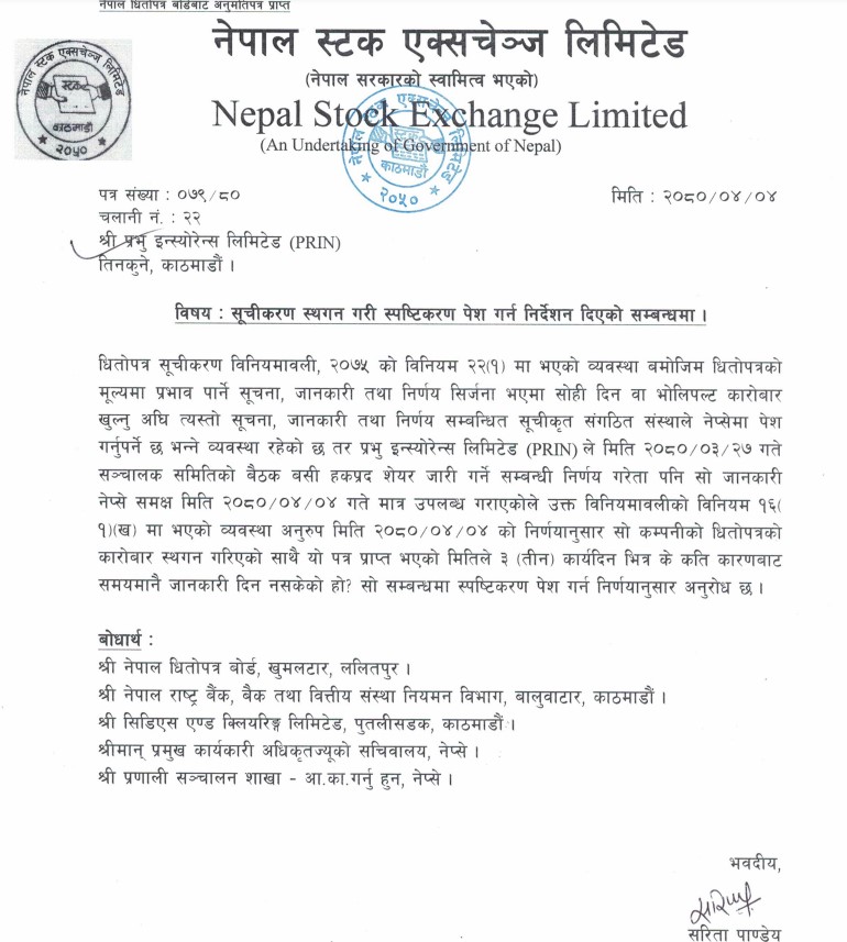 प्रभु इन्स्योरेन्सको सेयर कारोबार रोक्का, तीन दिनभित्र स्पष्टिकरण पेश गर्न निर्देशन