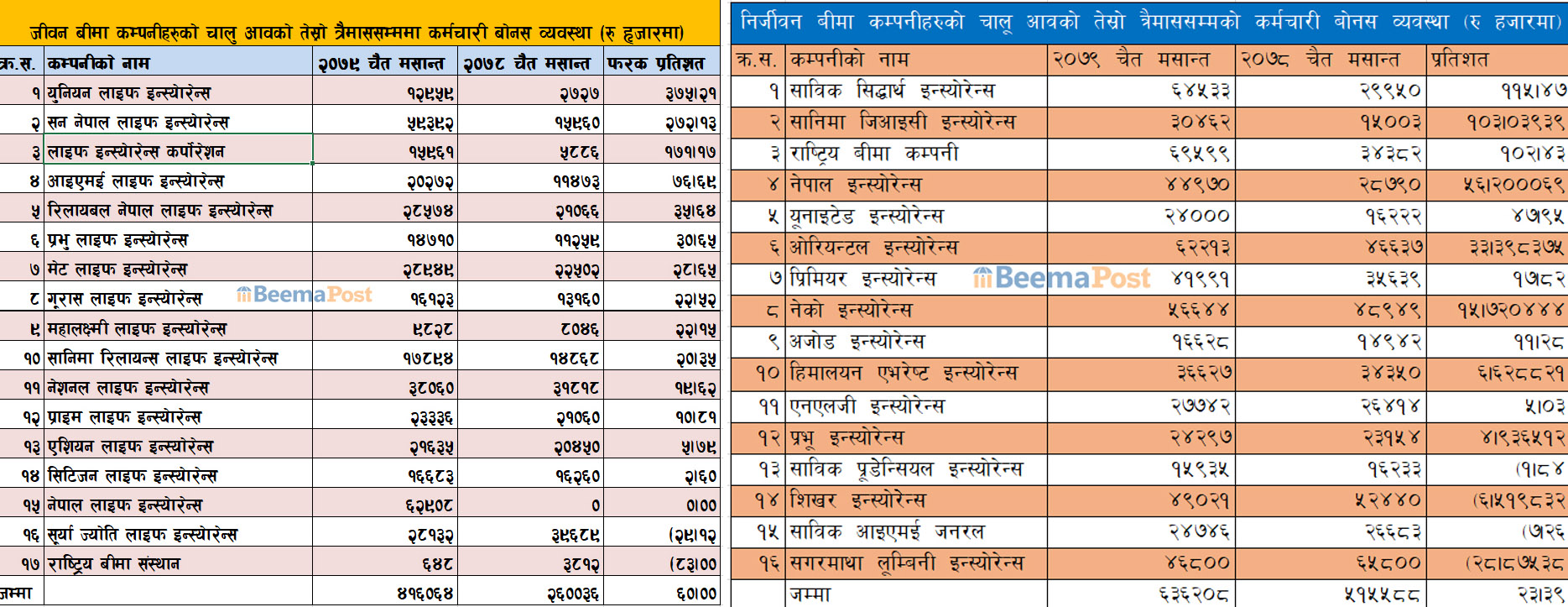 जीवन र निर्जीवन बीमा कम्पनीमा कार्यरत कर्मचारीले एक अर्ब पाँच करोड बोनस पाउने, कुन कम्पनीका कर्मचारीको बोनस व्यवस्था कस्तो ?
