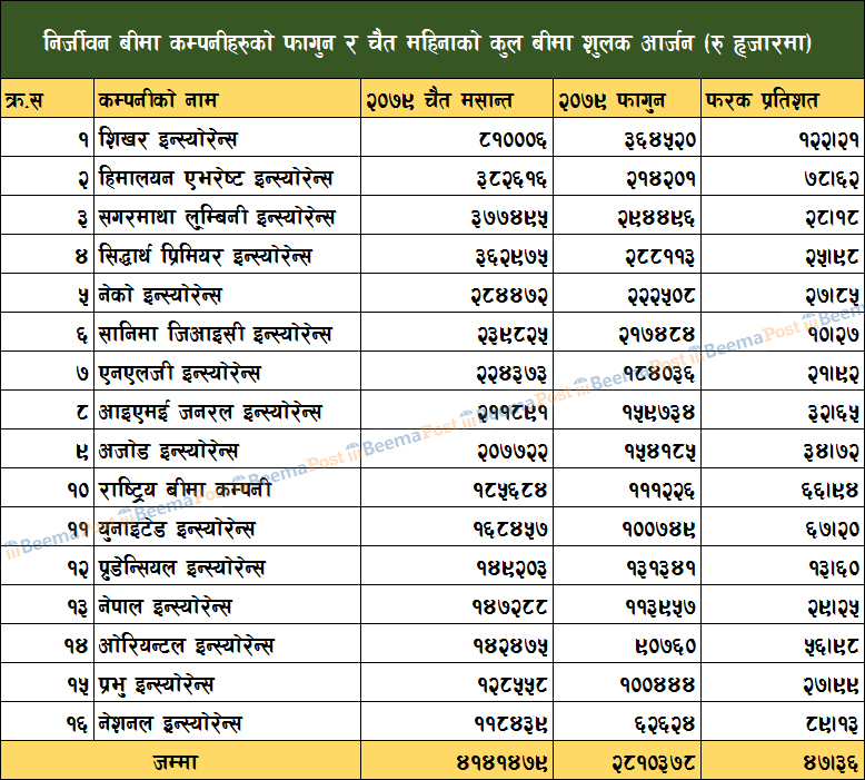 चैत महिनामा निर्जीवन बीमा कम्पनीको कुल बीमा शुल्क आर्जन ४ अर्बमाथि, शिखर, नेशनल र हिमालयन एभरेष्टको देखियो प्रगति