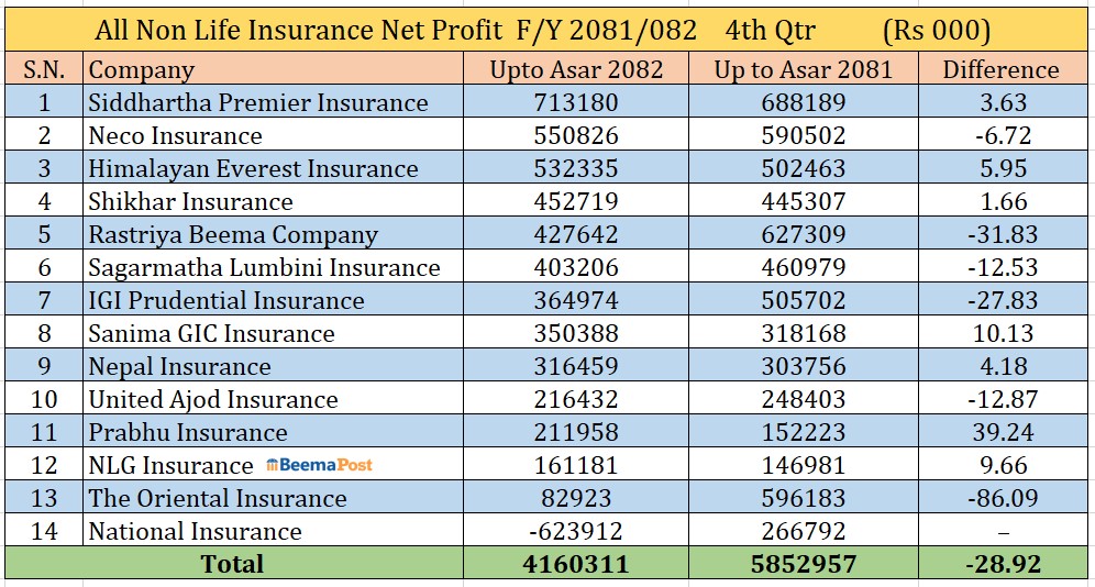 निर्जीवन बीमा कम्पनीले वर्षदिनमा कमाए ४ अर्ब मुनाफा, अग्रस्थानमा सिद्धार्थ प्रिमियर र नेको, प्रभु– सानिमा जिआईसीको उच्च ग्रोथ