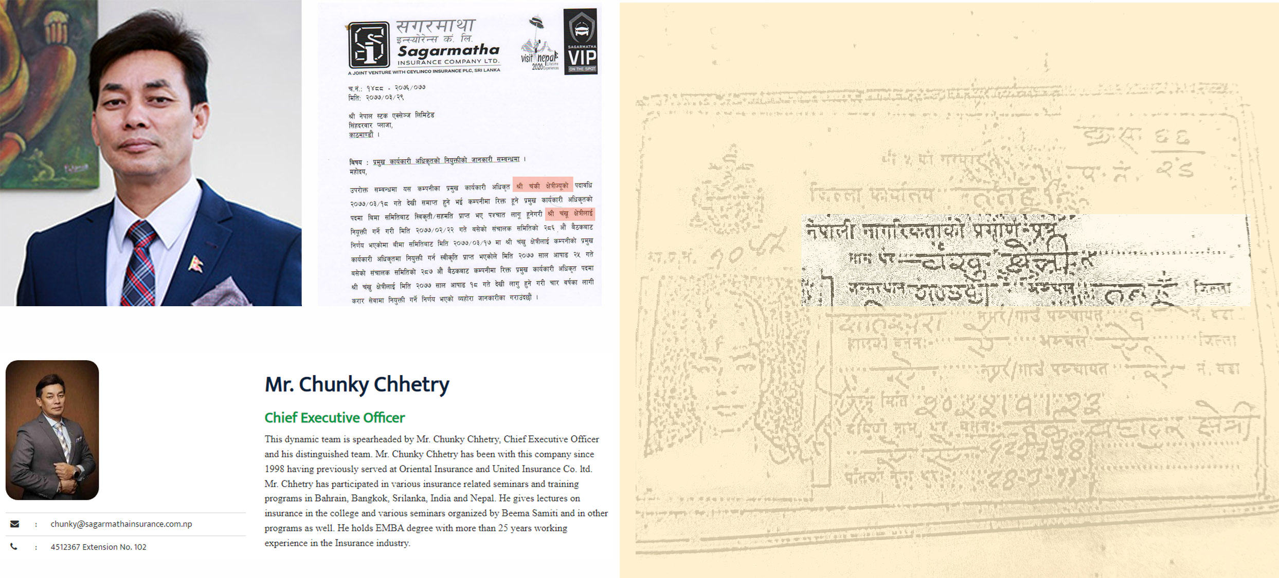 काठमाडौं । सगरमाथा लुम्बिनी इन्स्योरेन्स कम्पनीको सिईओमा प्रस्तावित व्यक्तिको तीन थरी नाम भएको तथ्य खुलेको छ । बीमापोष्टलाई प्राप्त कागजातमा सगरमाथा इन्स्योरेन्स कम्पनीमा पाँच वर्षभन्दा बढि समयदेखि चंकी क्षेत्रीको नाममा सिईओ भई कार्यरत रहेका व्यक्तिको चंकी क्षेत्री, चुँकी क्षेत्री र...