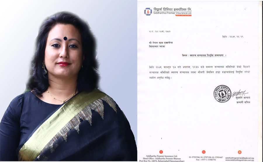 सिद्धार्थ प्रिमियर इन्स्योरेन्सको स्वतन्त्र संचालकमा जेसमिन हाडा बच्राचार्य नियुक्त