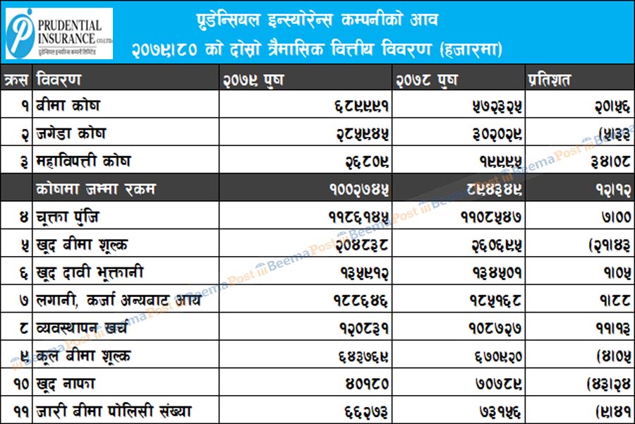 मर्जर प्रक्रियामा रहेको प्रुडेन्सियल इन्स्योरेन्सको नाफा ४३% ले घट्यो, इपीएस कति ?