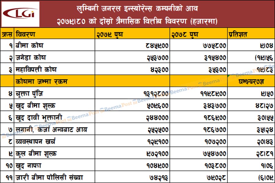 मर्जरको प्रकृयामा रहेको लुम्बिनी जनरल इन्स्योरेन्सको खुद बीमा शुल्क आर्जन ४८ प्रतिशत बढ्यो, मुनाफामा सामान्य सुधार