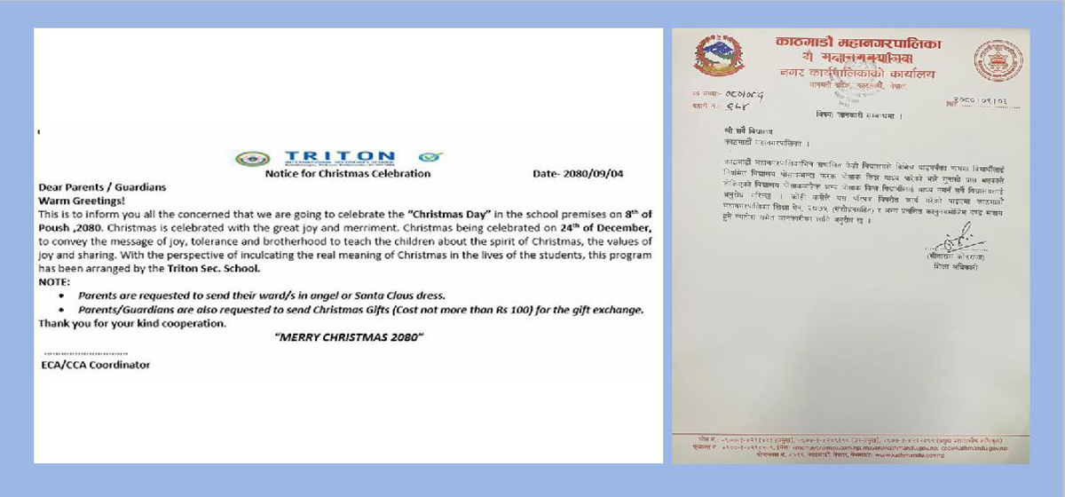 क्रिसमसका नाममा धर्म प्रचार गर्दै काठमाडौंका प्राइभेट स्कुल, ट्रिटनले पठायो अभिभावकलाई चिठी