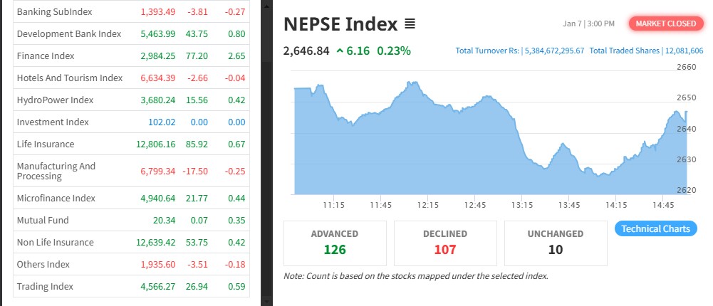 बजारमा हरियालीको निरन्तरताः परिसूचक २६४६ बिन्दुमा, फाइनान्समा देखियो चमक